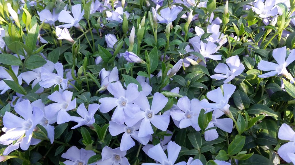 Eine wunderbare Erweiterung der Vinca-Farbpalette zeigt die neue Sorte Valentin PBR: zahlreiche, große und sehr hellblaue Blüten; besonders leuchtend auch am Morgen oder Abend.